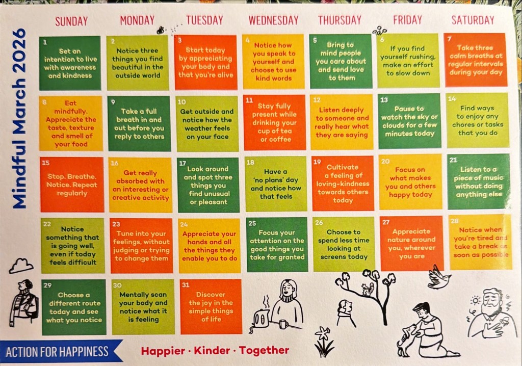 A lovely sentiment, but it was the other side that stopped me in my tracks. It was another invitation to many mindful mini adventures for each day of March. While Mindful March is almost over, I intend to keep the card and do each of these ‘Actions for happiness’ in April. My favourite one is: ‘Discover the joy in the simple things of life.’